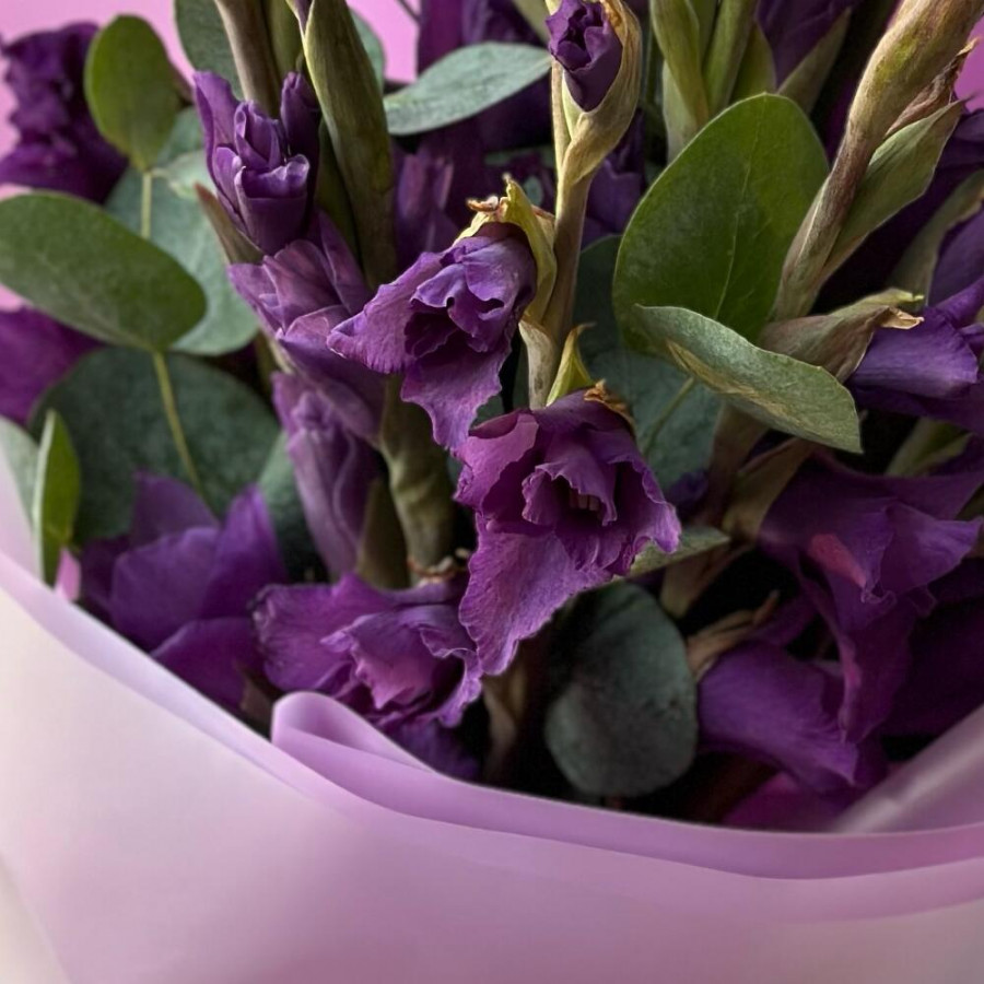 На фото букет из 9 фиолетовых гладиолусов. В составе: гладиолус 9 шт, дизайнерская упаковка 2 шт, атласная лента 2 шт, . Все цветы свежие и ароматные, букет красиво оформлен и отлично подходит для подарка. Доступна доставка цветов или самовывоз.