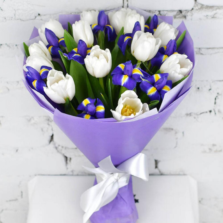 Букет из синих ирисов и белых тюльпанов в Альметьевске