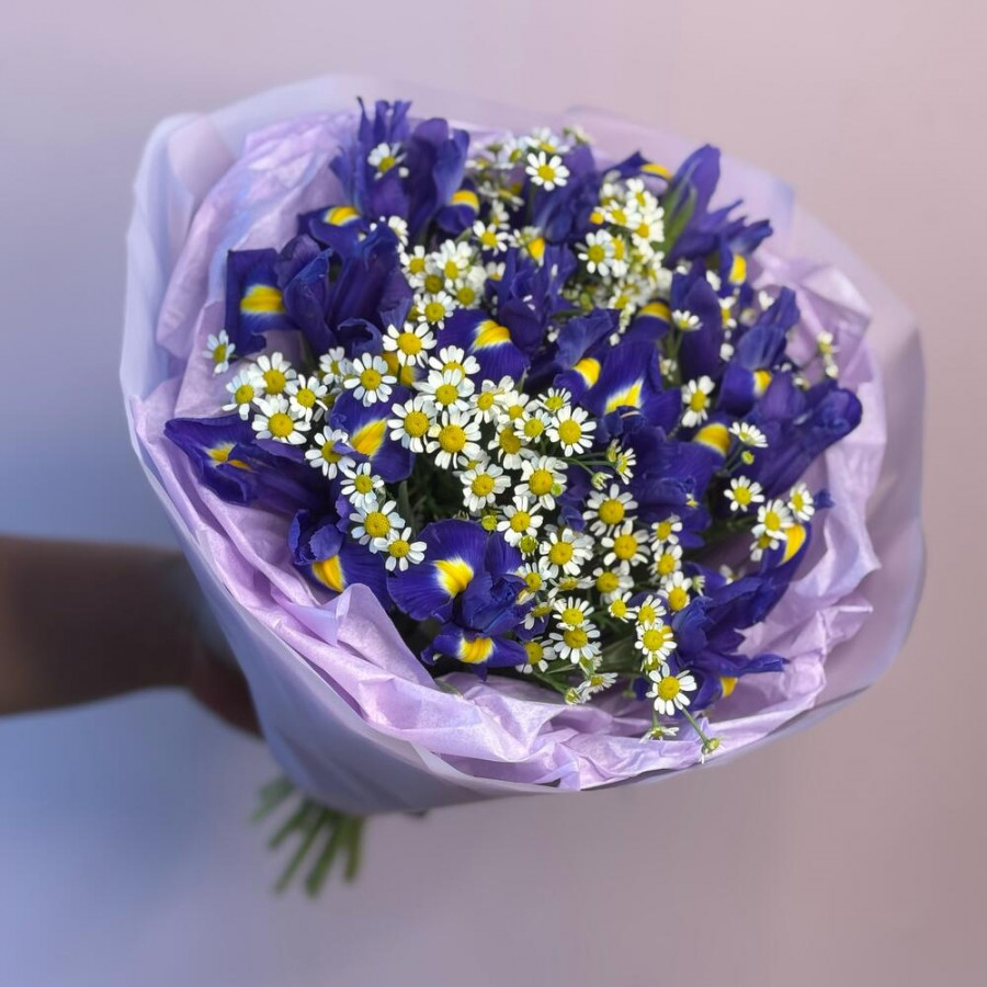 На фото букет из ирисов и ромашек. В составе: ирис 11 шт, танацетум 6 шт, дизайнерская упаковка 2 шт, атласная лента 1 шт, . Все цветы свежие и ароматные, букет красиво оформлен и отлично подходит для подарка. Доступна доставка цветов или самовывоз.