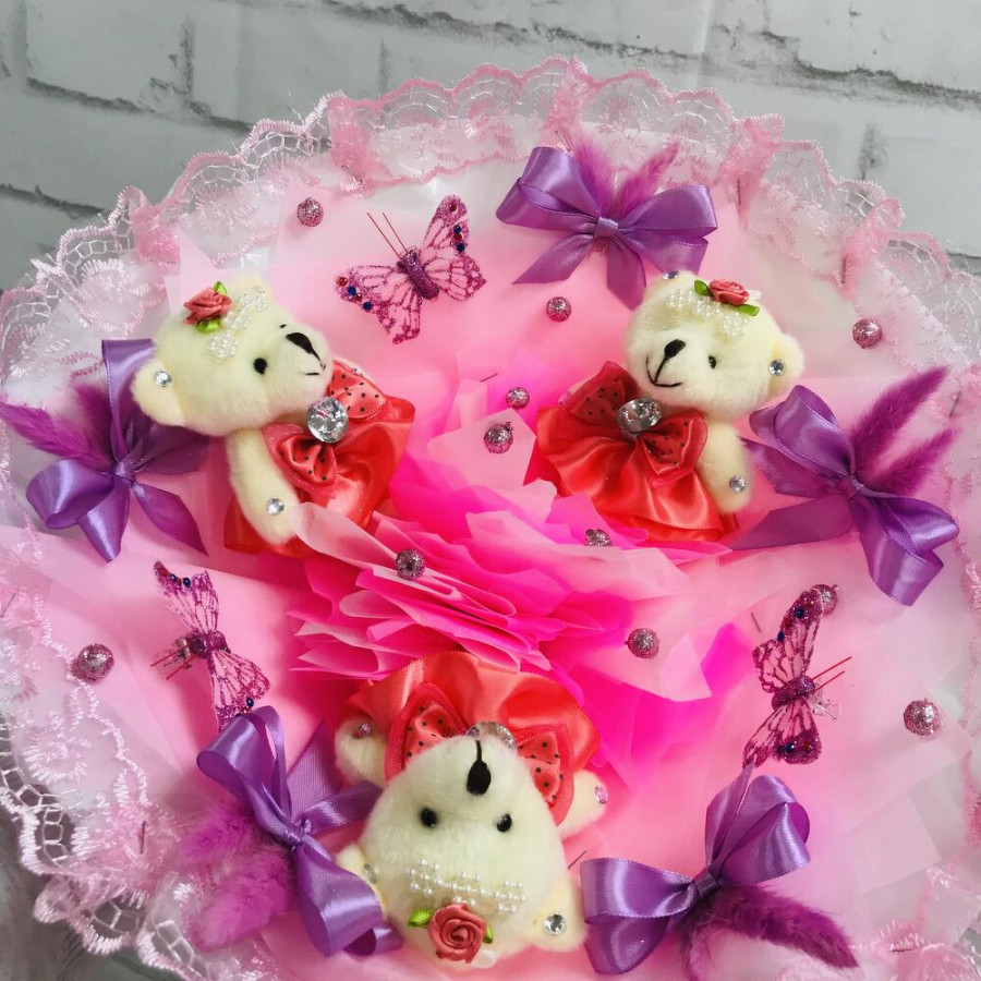 На фото букет из игрушек мишек и бабочек. В составе: . Все цветы свежие и ароматные, букет красиво оформлен и отлично подходит для подарка. Доступна доставка цветов или самовывоз.