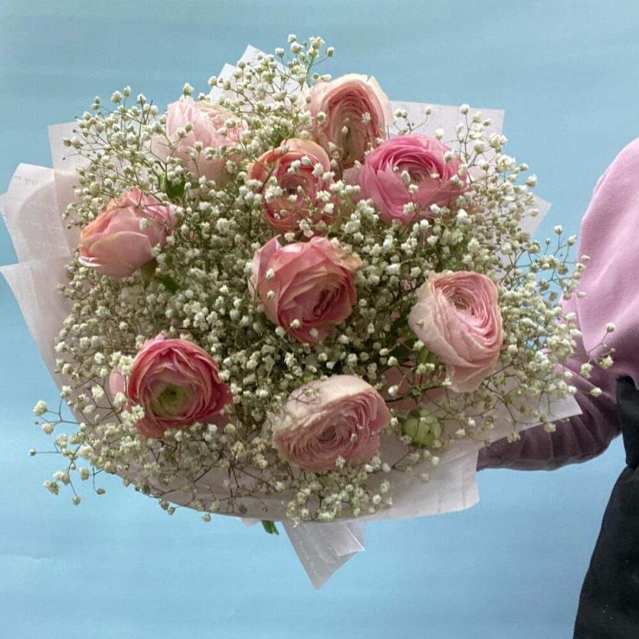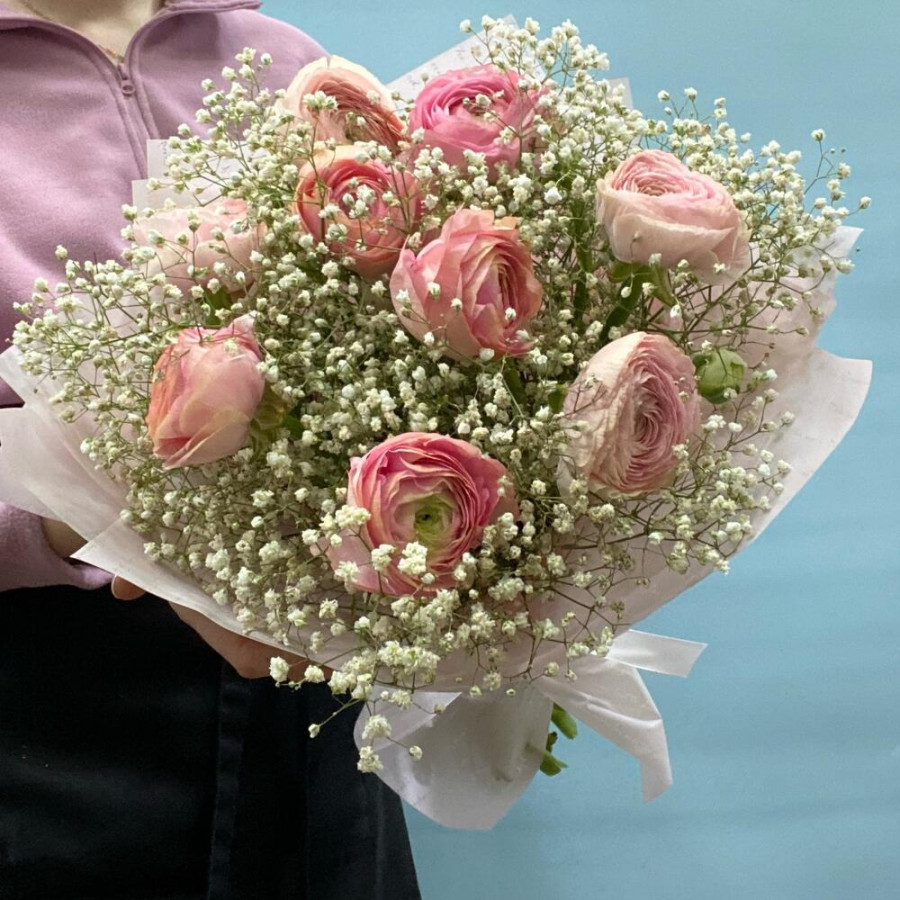 Букет из розовых ранункулюсов с белой гипсофилой в Альметьевске