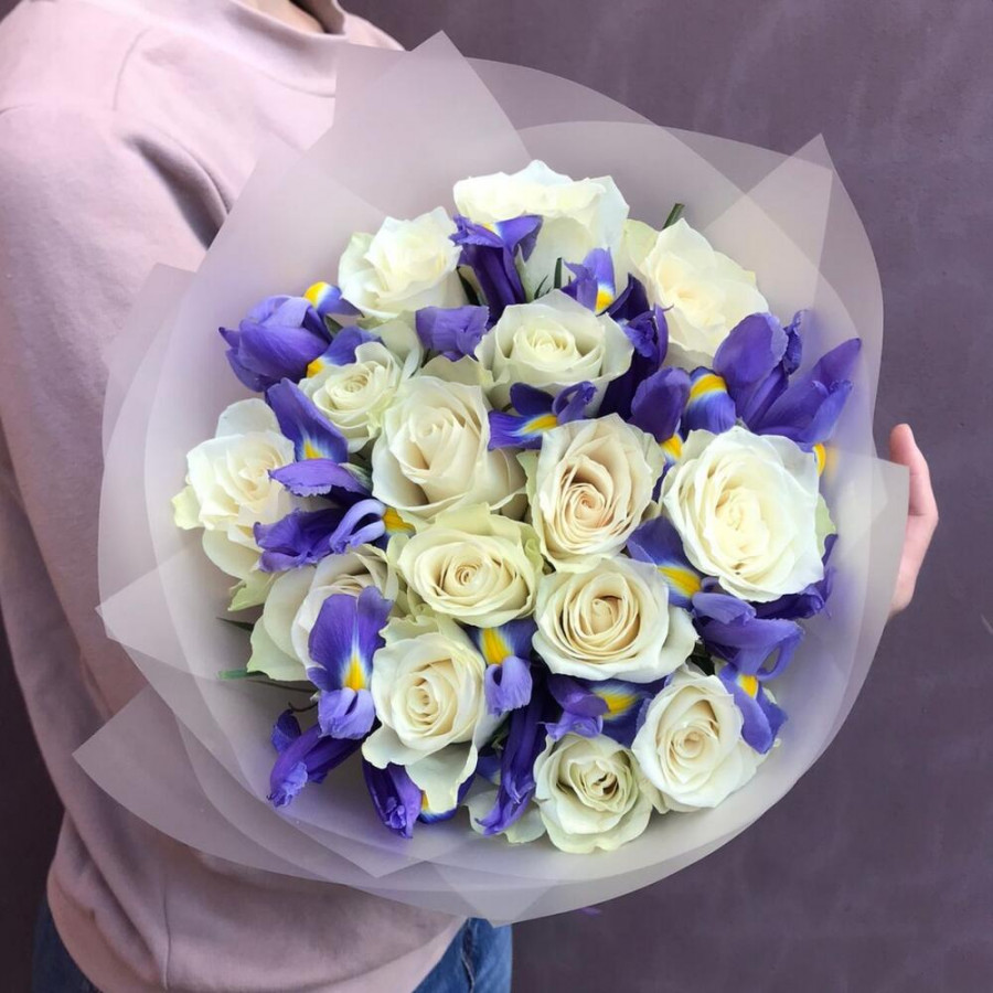 На фото букет из белых роз и синих ирисов. В составе: роза 15 шт, ирис 8 шт, дизайнерская упаковка 1 шт, атласная лента 1 шт, . Все цветы свежие и ароматные, букет красиво оформлен и отлично подходит для подарка. Доступна доставка цветов или самовывоз.